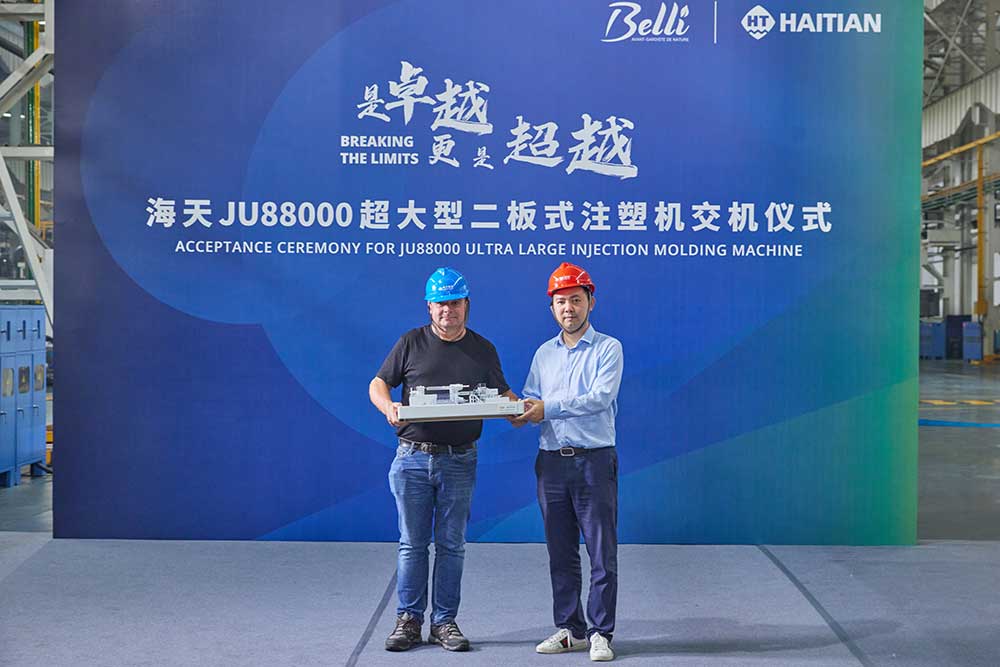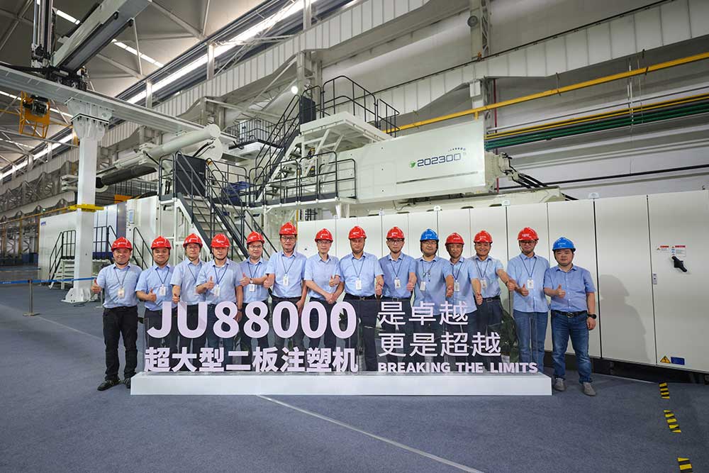 此次交付的海天JU系列8800吨超大型注塑机,额定锁模力达88000kN,注射容量达134000立方厘米,刷新行业纪录,实现了超大型注塑机研发制造能力的突破。